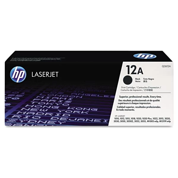 HP 12A, (Q2612A) Black Original LaserJet Toner Cartridge – Toner cartridge is designed for use with Hewlett-Packard LaserJet 1012, 1018, 1020, 1022, 1022n, 1022nw, M1319f MFP, 3015, 3020, 3030, 3050, 3052 and 3055. HP’s UltraPrecise dual-polymer toner and helical roller drive work together in a system designed to provide reliable, cost-effective performance over the life of the cartridge. Cartridge yields approximately 2,000 pages.