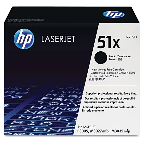 HP 51X, (Q7551X) High-Yield Black Original LaserJet Toner Cartridge – Toner cartridge is designed for use with Hewlett-Packard LaserJet P3005 Series, M3027 MFP and M3035 MFP.