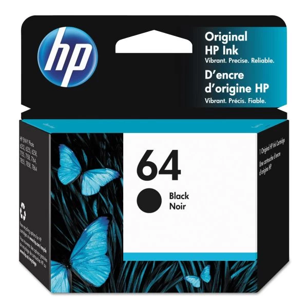 HP 64, (N9J90AN) Black Original Ink Cartridge – Create lab-quality color photos and everyday documents with this Original HP ink cartridge. Ensure that your printing is right the first time and every time in your HP Envy 4520 Photo 6255, 7155 and 7855 All-in-One Printers. This cartridge is designed with fraud protection and smart low-ink alerts to deliver worry-free performance and consistent results you can count on. Produce laser-quality documents with crisp text and sharp graphics that can make an impact and last for decades. Ink cartridge delivers easy mobile printing. Cartridge yields up to 200 pages.