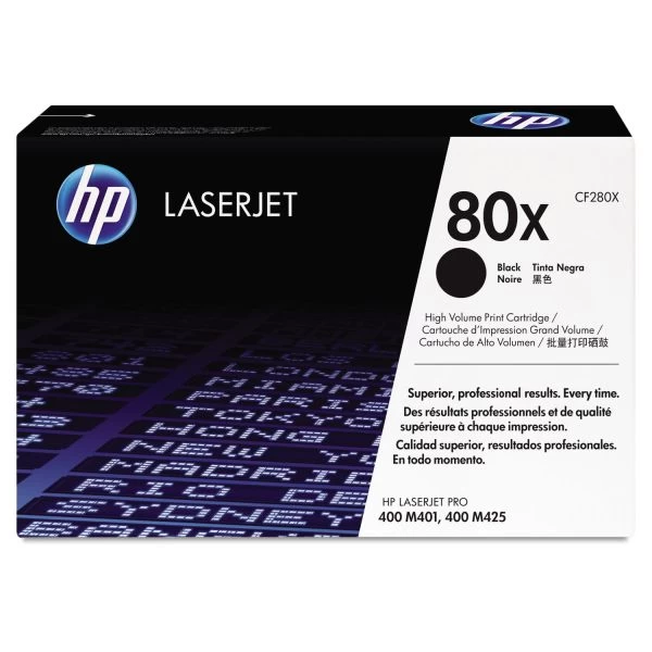 HP 80X, (CF280X) High-Yield Black Original LaserJet Toner Cartridge – Toner cartridge delivers sharp detail and consistent gray scale for charts and graphs so you get business-quality results on a wide range of laser papers. Make an impact with professional-quality, black/white documents and crisp, black text. Keep printing costs low while maintaining productivity. HP toner cartridges deliver consistent, uninterrupted printing. Because cartridge is designed for exceptional reliability, you avoid wasted supplies and expensive delays. Replacement cartridge is quick and easy to install. Cartridge is designed for use with HP LaserJet 400 M401n, M401dn, M401dw and M425dn. Cartridge yields approximately 6,900 pages.