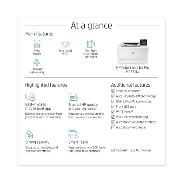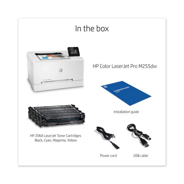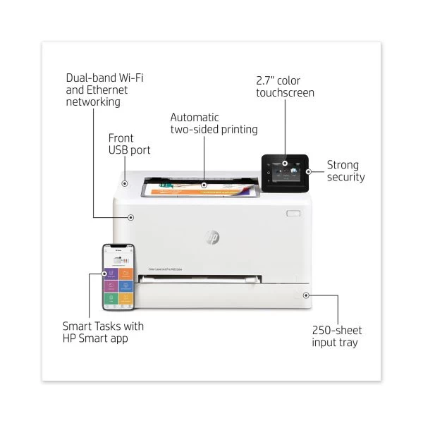 HP Color LaserJet Pro M255dw Wireless Laser Printer – Impress with color and increase efficiency. Get high-quality color and fast two-sided print speeds. Save time with Smart Task shortcuts in HP Smart app, and print and scan from your phone. Get seamless connections and strong security solutions.