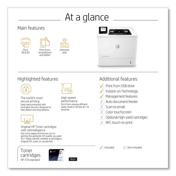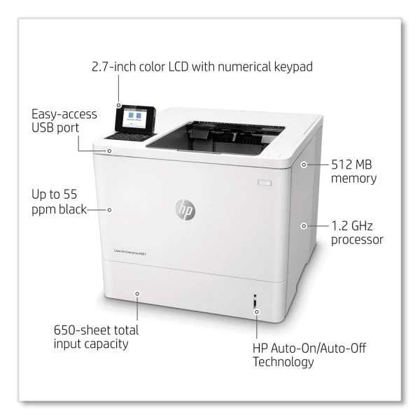 HP LaserJet Enterprise M607n Wireless Laser Printer – LaserJet printer with a 2.7″ LCD combines exceptional performance and energy efficiency with professional-quality documents, all while protecting your network with top of the line security. With HP Sure Start, this printer regularly checks its operating code and repairs itself from attempted hacks to help prevent potential attacks. Runtime intrusion detection continually monitors to detect and stop attacks, then automatically reboots. Its fast start time wakes up quickly and prints your first page in as little as 5.3 seconds for time-saving performance. Centralize control of your printing environment with Web Jetadmin and help build business efficiency with confidence. Printer also features 512MB memory, 1.2 GHz processor speed, 100-sheet multipurpose feeder, 550-sheet input feeder, 500-sheet output bin and more.