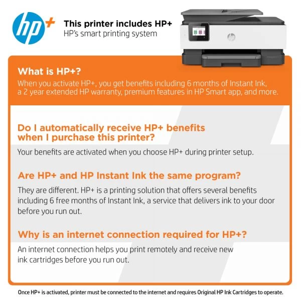 - HP+ SMART PRINTING SYSTEM – The optional HP+ system enables your printer to think ahead so it’s more secure, more productive and ready when you are. Requires an HP account, internet connection and use of only Original HP Ink for the life of the printer.