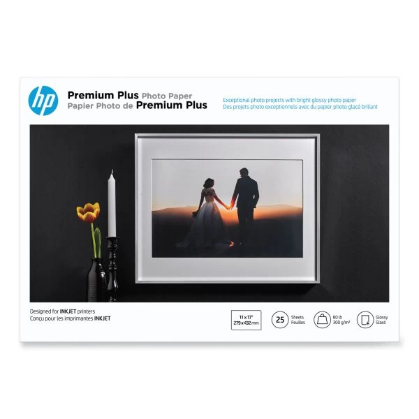 HP Premium Plus Photo Paper, 11.5 mil, 11 x 17, Glossy White, 25/Pack – Premium Plus Photo Paper delivers professional-quality photos with Hewlett-Packard Vivera inks that resist fading for generations. Smooth gloss finish, sturdy thickness and weight rival professional photographs. Professional-quality sheets maximize color intensity. Unique HP back-coating prevents prints from sticking when stacked. Ideal for family and important event photos.
